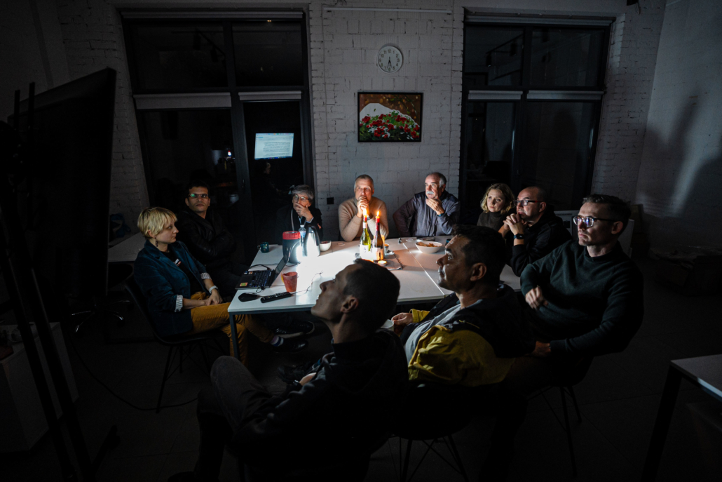 Med daglige turer til bomberom, nabolag som blir truffet av misiler og stadige strømbrudd, jobber PEN Ukraina for å fremme og forsvare ukrainsk litteratur og kultur. Strømmen var også gått da den internasjonale delegasjonen skrev sin resolusjon i oktober 2025. Foto: PEN Ukraina/ Anastasiia Mantach & Artem Galkin